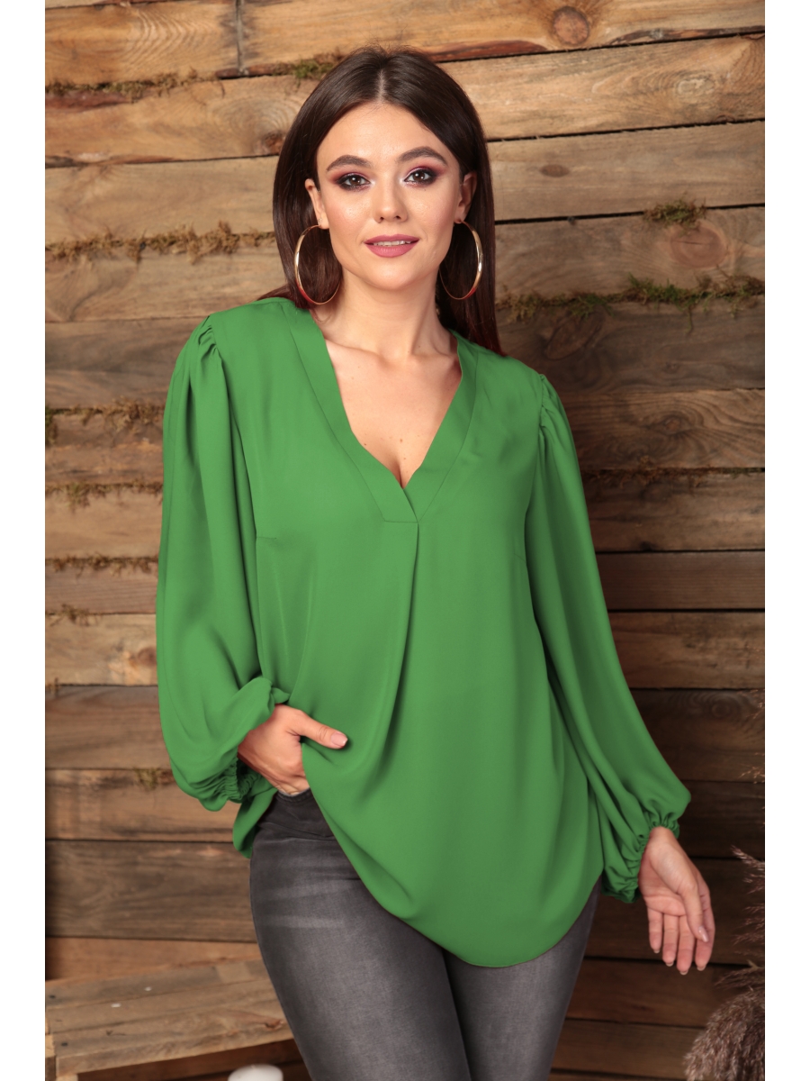 Блуза женская, полуприлегающего силуэта. По полочке идет нагрудная выточка из бокового шва. Вырез V-образной формы с планками и складкой по центру. По спинке средний шов, рукав объёмный, по окату сборка. Низ рукава фигурный, на резинке.