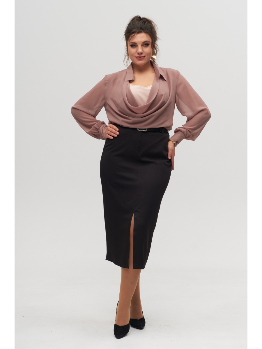 Полуприлегающий силуэт,втачной длинный рукав на манжете,воротник сорочечного типа с застежкой на пуговицу. Особенностью модели является элегантная драпировка по переду.