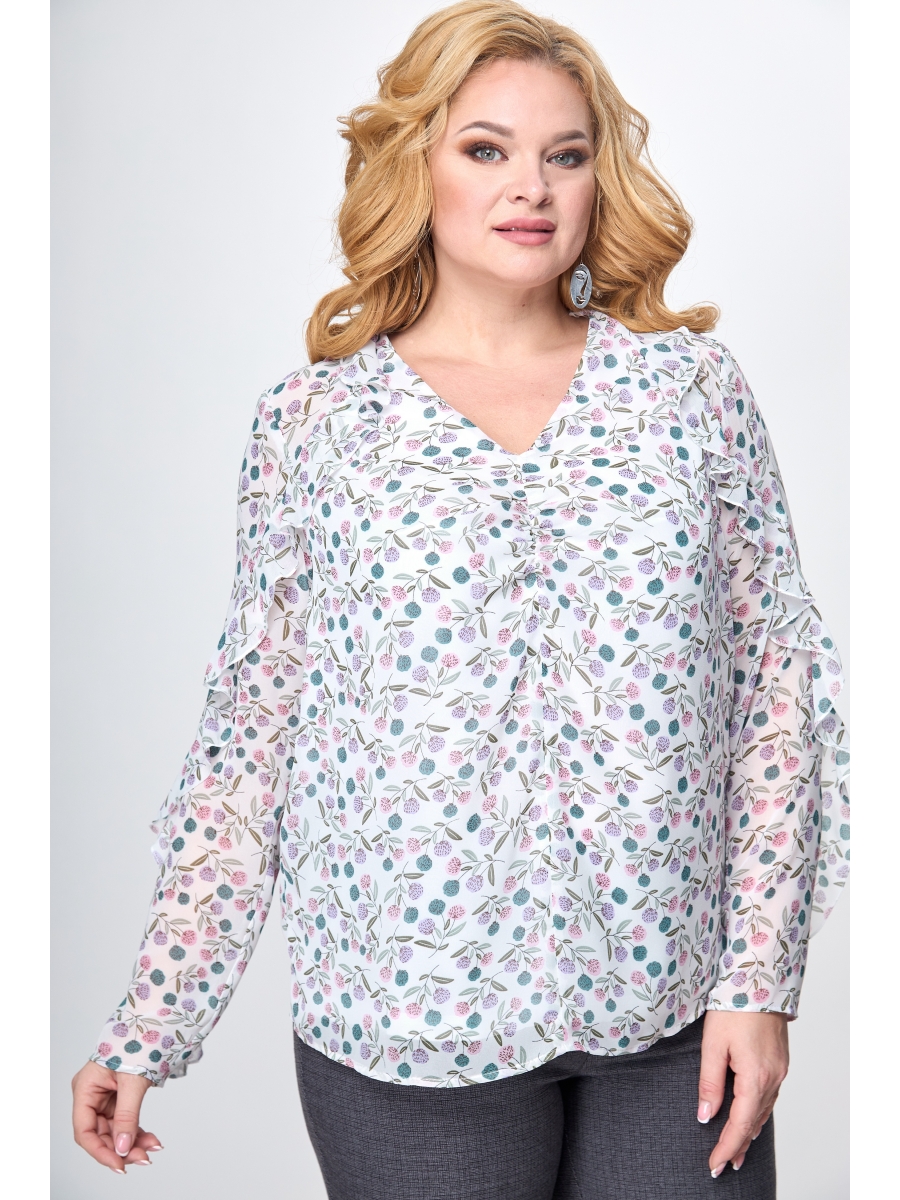 Блуза из принтованной шифоновой ткани. Прямой силуэт с втачными рукавами. По переду в области груди небольшая сборка. Романтичные нотки в блузе добавляет волан, который начинается от линии горловины по фигурной кокетке и продолжается по рукаву спирально. Элегантный v-образный вырез горловины. Перед блузы выполнен на подкладке.