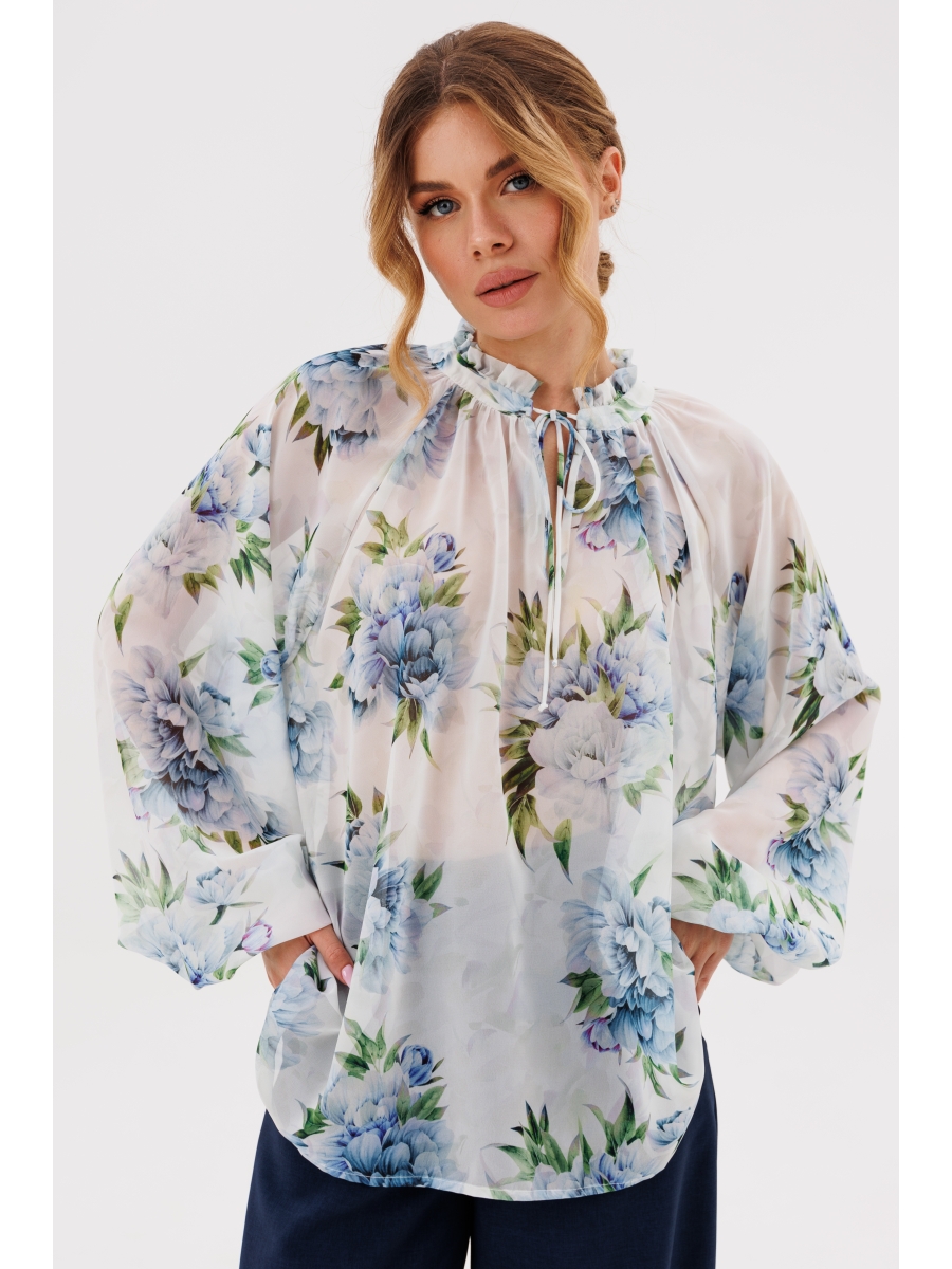 Блузка свободного силуэта (стиль оверсайз) с рукавом реглан. Горловина с разрезом спереди и притачной планкой с рюшей. Рукав на манжете. Перед и спинка блузы на подкладке.