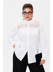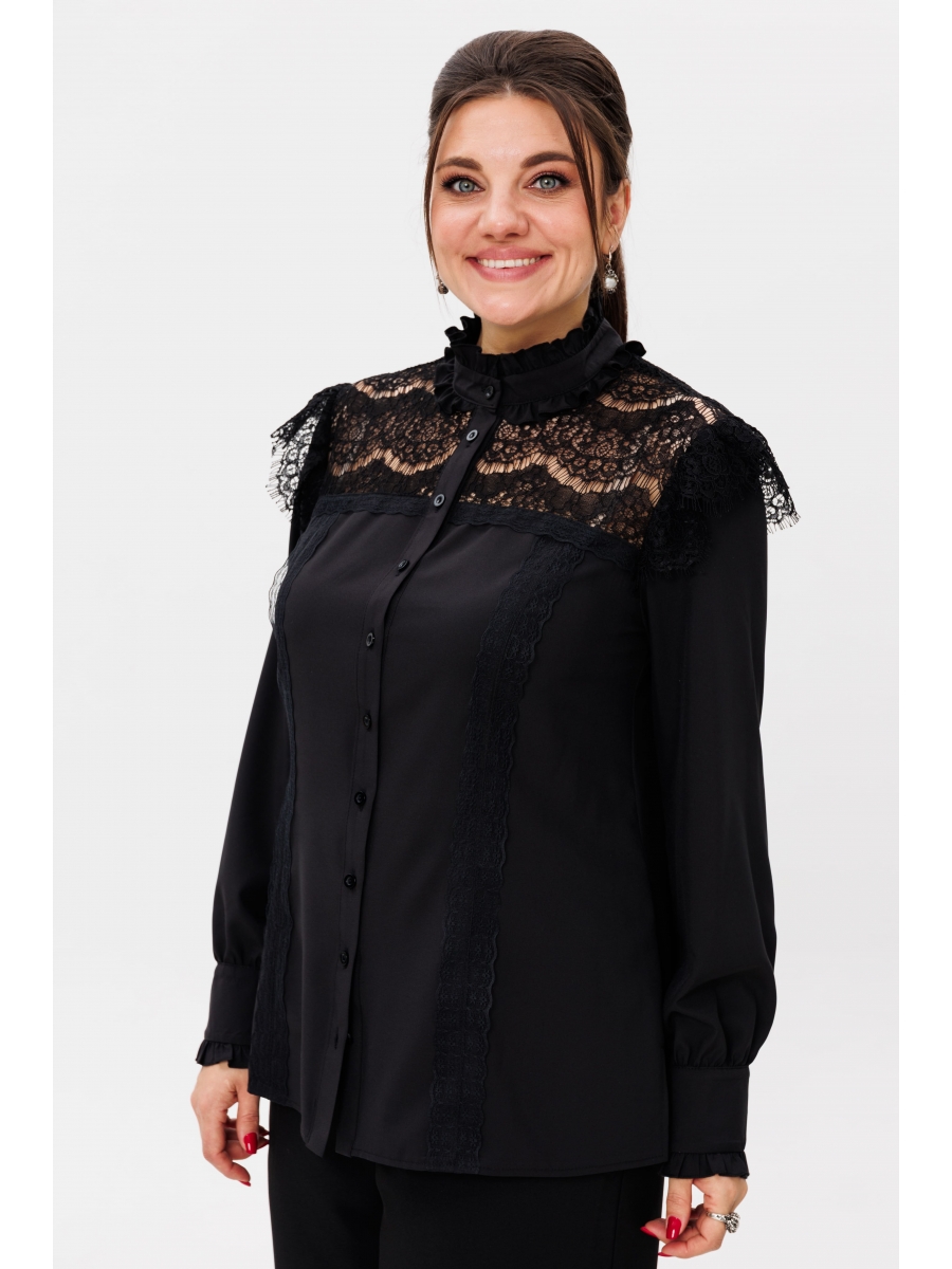 Воротник-стойка, отделанный тонкой оборкой, создает элегантный акцент, подчеркивающий линию шеи и добавляющий образу нотку sophistication. Кокетки на спинке и полочке, украшенные кружевом, делают блузу по-настоящему уникальной, добавляя ей легкости и романтичности.