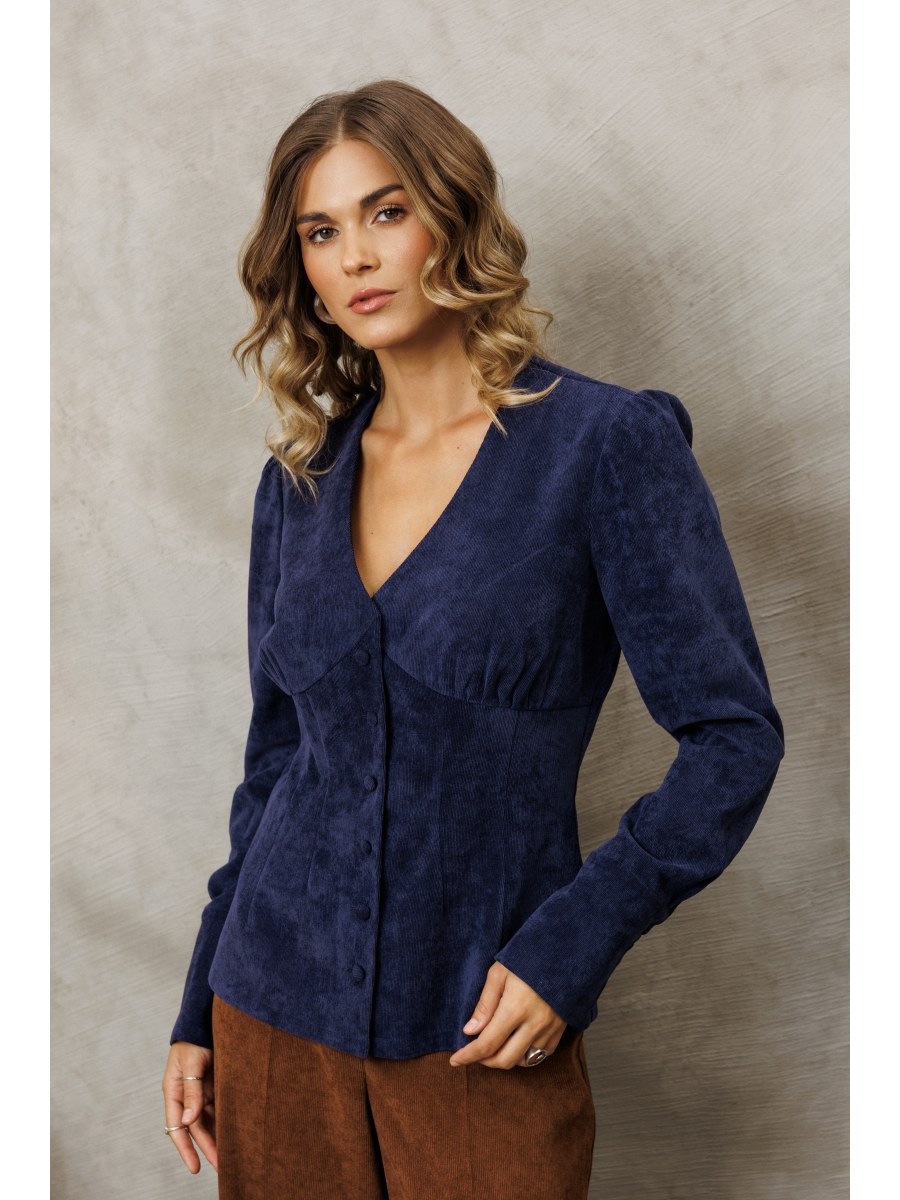 Блузка оригинальная приталенного силуэта из вельветовой ткани. Перед с подрезом под грудью, сборкой в районе груди и талиевыми вытачками. Застёжка на петли и пуговицы. Горловина V-образной формы. Спинка с талиевыми вытачками. Рукав втачной со сборкой по окату и с манжетой по низу. Манжета высокая с двумя петлями и пуговицами.