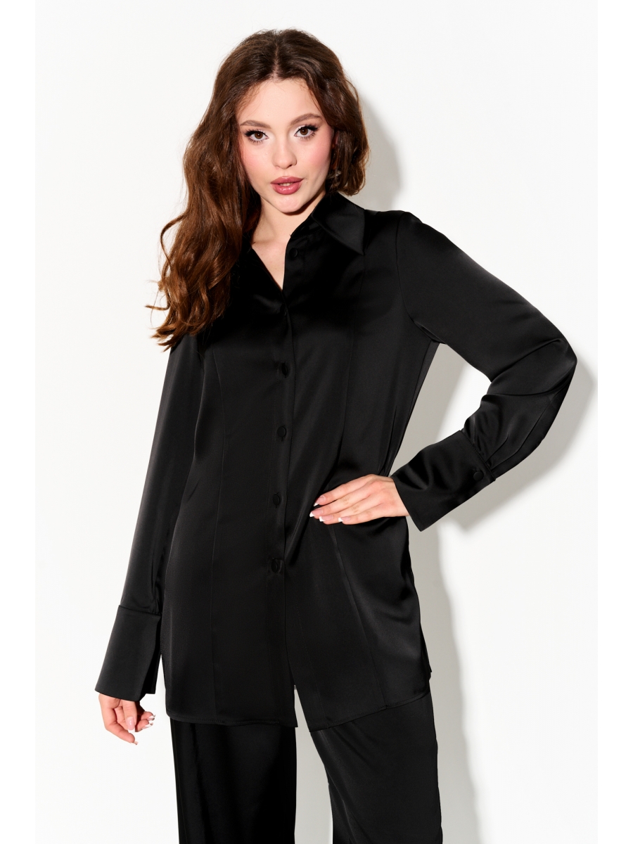 Базовая женская рубашка полуприлегающего силуэта выполнена из струящейся ткани с содержанием шёлка. Рукава втачные с мягкими складками по низу рукава и высокой манжетой с одной функциональной пуговицей; по переду рельфы; воротник рубашечный; в боковых швах декоративные разрезы; застёжка по переду на петли и пуговицы. Рубашка полностью соответствует заявленному размеру.
