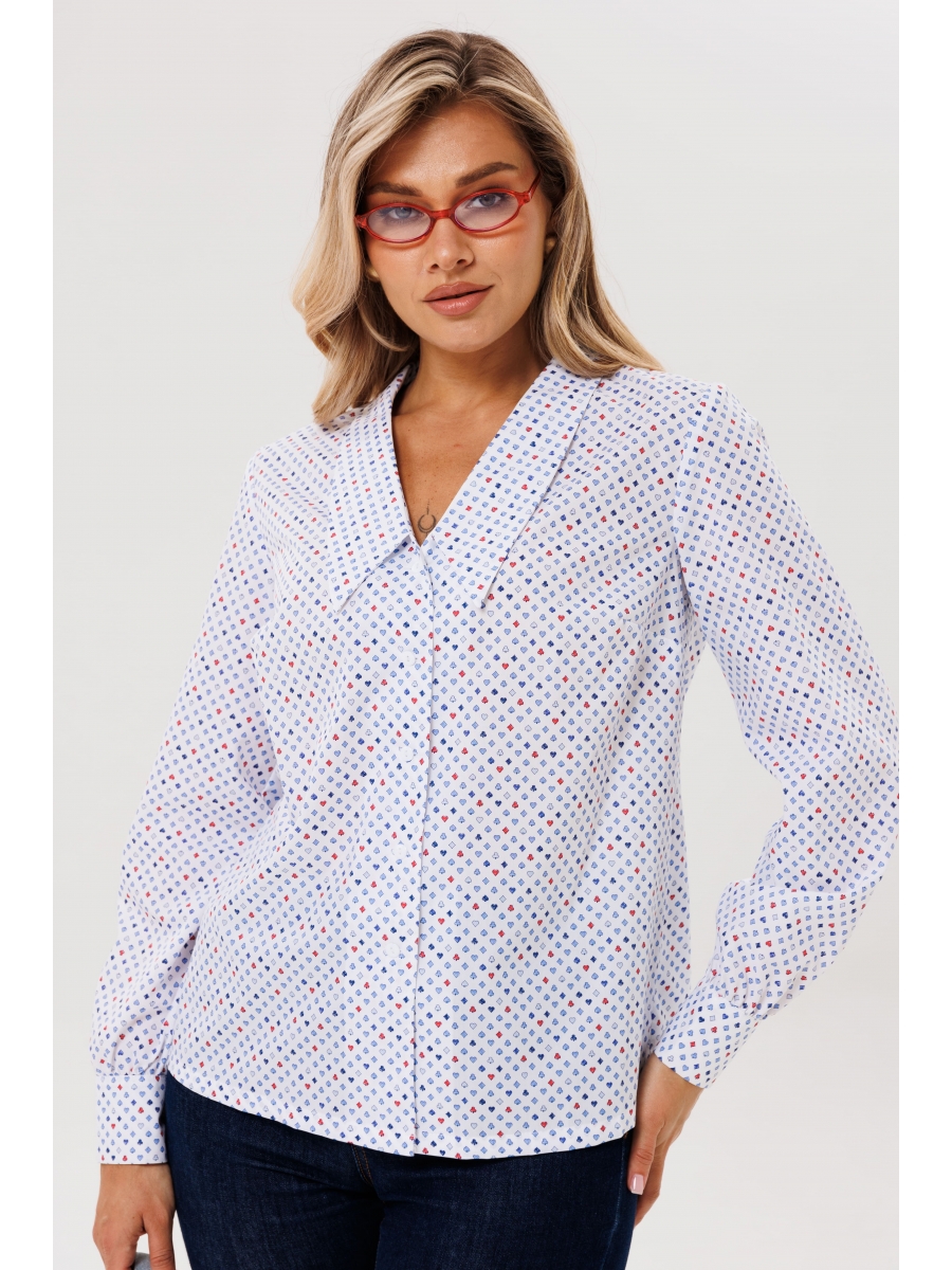 Выполнена из высококачественного хлопка, украшенного интеллектуальным и игривым принтом, вдохновленным изысканными карточными мастями. Главной же особенностью, задающей тон всему силуэту, является актуальный удлиненный воротник, который ниспадает изящными линиями, создавая современный и утонченный акцент.