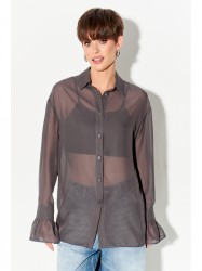 Женская лёгкая рубашка полуприлегающего силуэта выполнена из шифона. Рукава с манжетами и небольшой сборкой; воротник рубашечный; застёжка на петли и пуговицы. Рубашка полностью соответствует заявленному размеру.