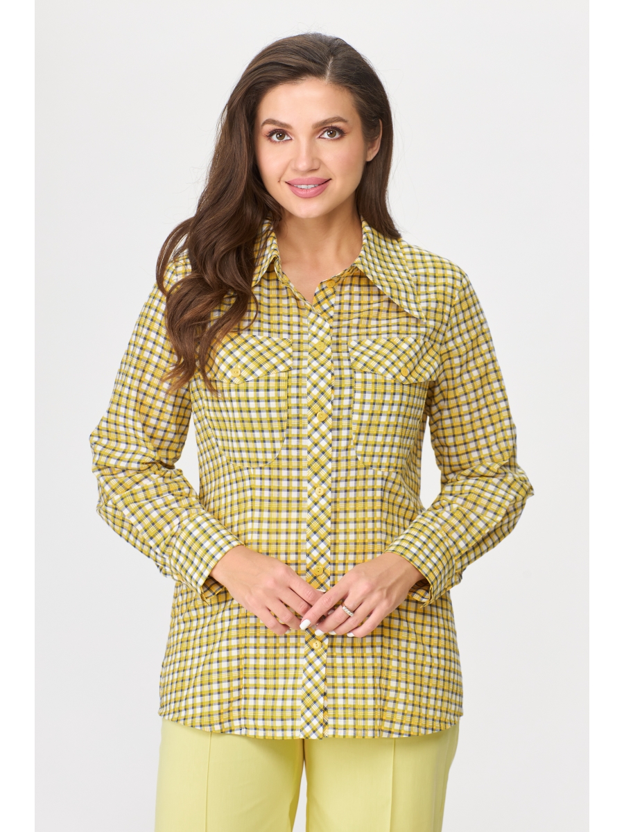 Представляем новинку от белорусского бренда Abbi – женскую рубашку. Рубашка из легкой хлопковой ткани с веселыми летними тонами может украсить ваш гардероб не только летом, но и в любую другую пору года. Рубашка женская из хлопка с принтом «клетка», полуприлегающего силуэта, длина ниже линии бедер. По переду и спинке двойная кокетка, воротник втачной большой, стойка отрезная, рукав втачной рубашечный, по низу рукава широкий манжет с застежкой на две петли и две пуговицы. По переду талиевые вытачки, два больших накладных кармана округлой формы, два клапана с застежкой на петлю и пуговицу. Застежка центральная на отрезной планке, нить основы планки под углом 45 градусов,на 7 петель и 7 пуговиц.