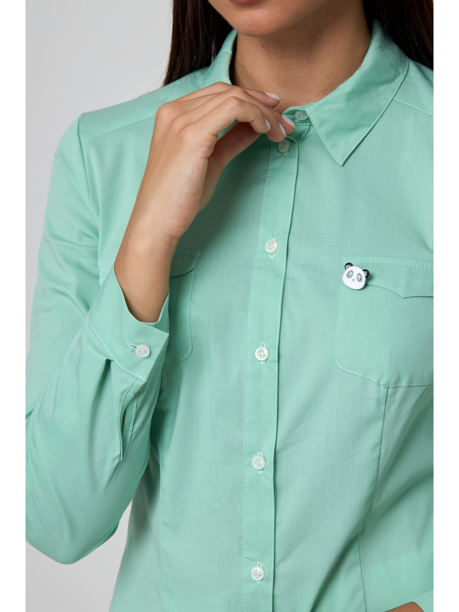 Блузка классического покроя. Полочки с нагрудными вытачками от низа, накладными карманами с закруглёнными краями. Спинка с талевыми вытачками и цельнокроеной кокеткой, переходящей на полочку. Воротник на стойке, застежка на пуговицы на цельнокроеной планке. Рукава втачные с манжетами на пуговицы, рукав регулируется патой на пуговицу.