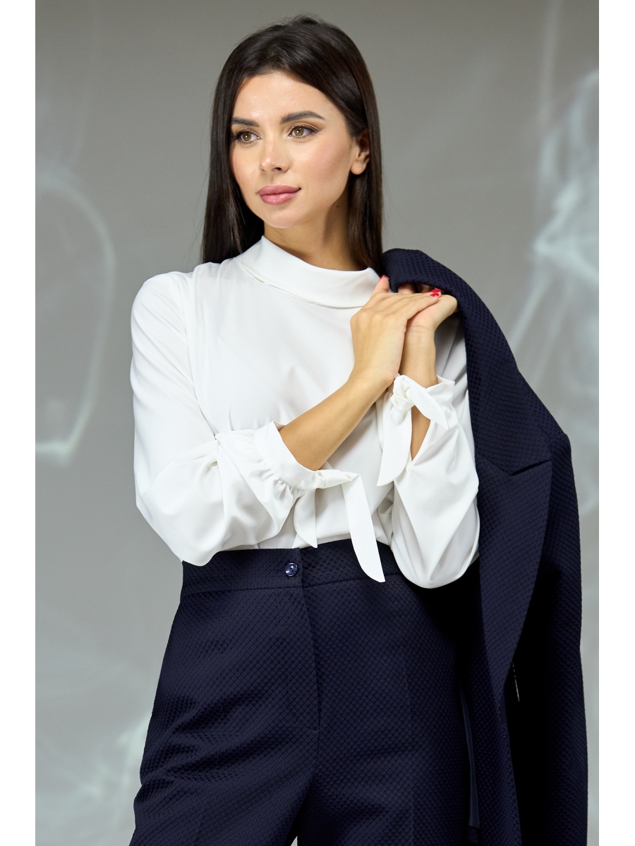 Блуза прямого силуэта до середины бедер. Воротник стояче-отложной. По спинке средний шов с капелькой, застегивающейся на навесную петельку и пуговицу. Рукав прямой, низ рукава присборен на декоративную манжету с завязками.