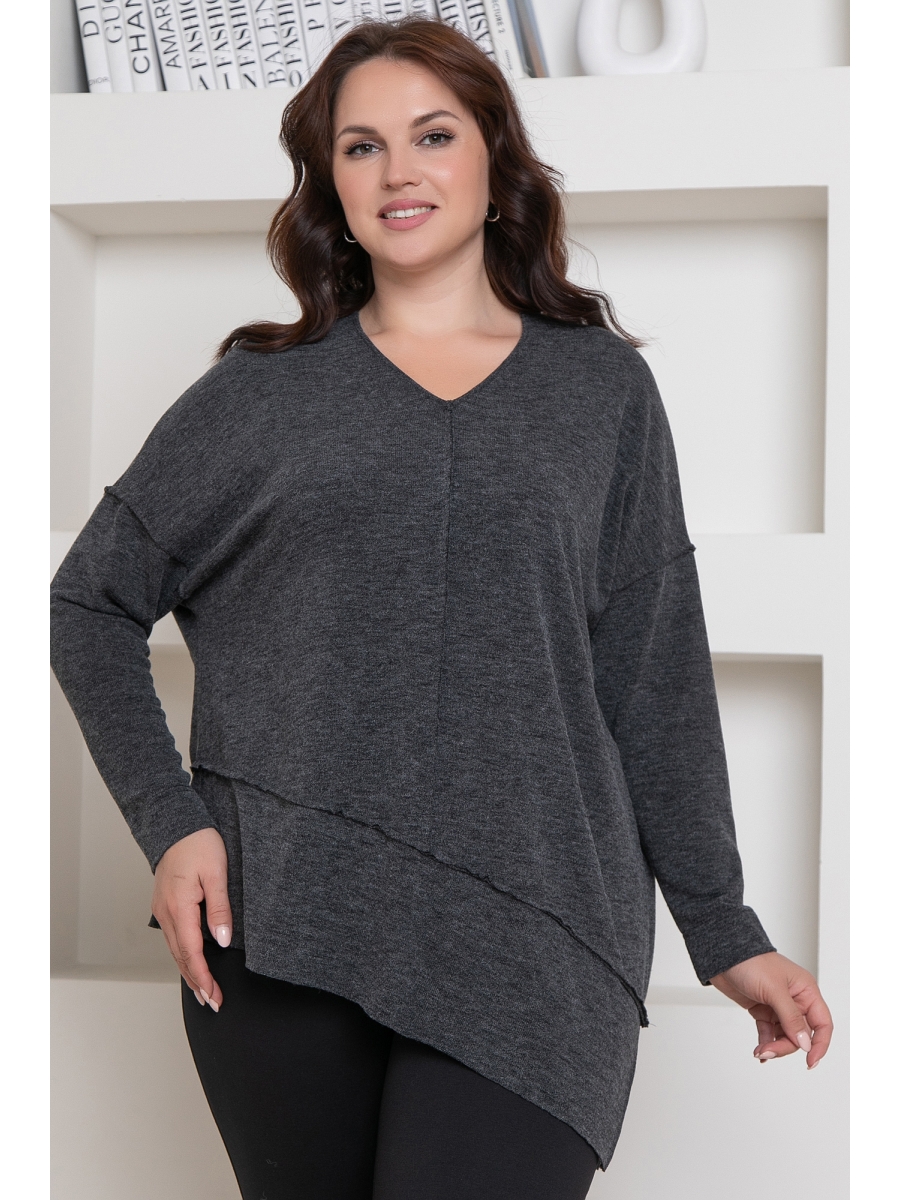 Блуза женская А-образного силуэта из триотажного полотна средней плотности, разноуровневая. Горловина V-образная, плечо спущенное, рукав втачной длинный.