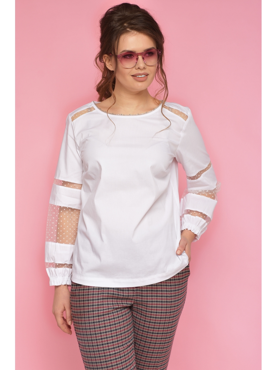 Блуза, свободного кроя, ХБ с гипюровыми вставками. Рукав на резинке. Вырез горловины круглый, декорирован серебряной цепочкой бусинками.