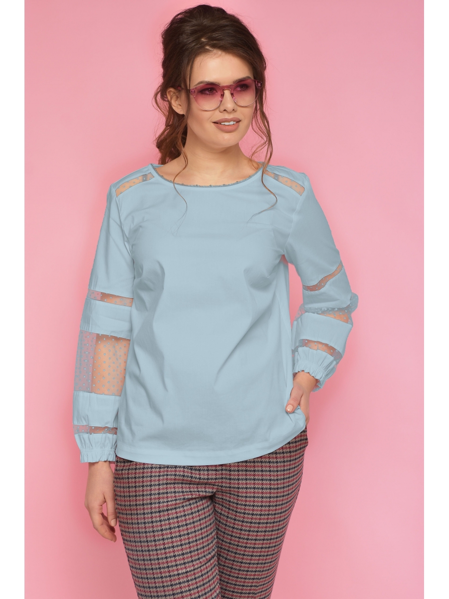Блуза, свободного кроя, ХБ с гипюровыми вставками. Рукав на резинке. Вырез горловины круглый, декорирован серебряной цепочкой бусинками.