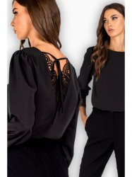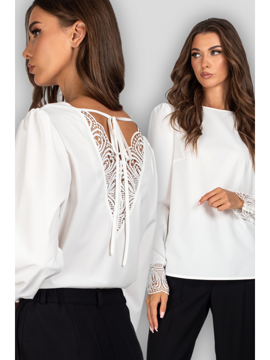Блузка женская, полуприлегающего силуэта. Передняя часть блузки с нагрудными выточками. Спинка со вставкой из кружева и с завязками. Рукав втачной присборенный по окату и низу, с притачной манжетой, выполненной из кружева. Манжета застегивается на 4 навесные петли и пуговицы.