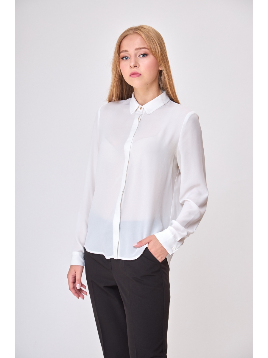 Универсальная классическая блуза-рубашка из легкой ткани. Застежка потайная по планке на петли-пуговицы. На воротнике и манжетах пуговица декоративная. Воротник рубашечного типа на стойке. Рукав длинный с манжетой. Низ по спинке чуть длиннее переда.