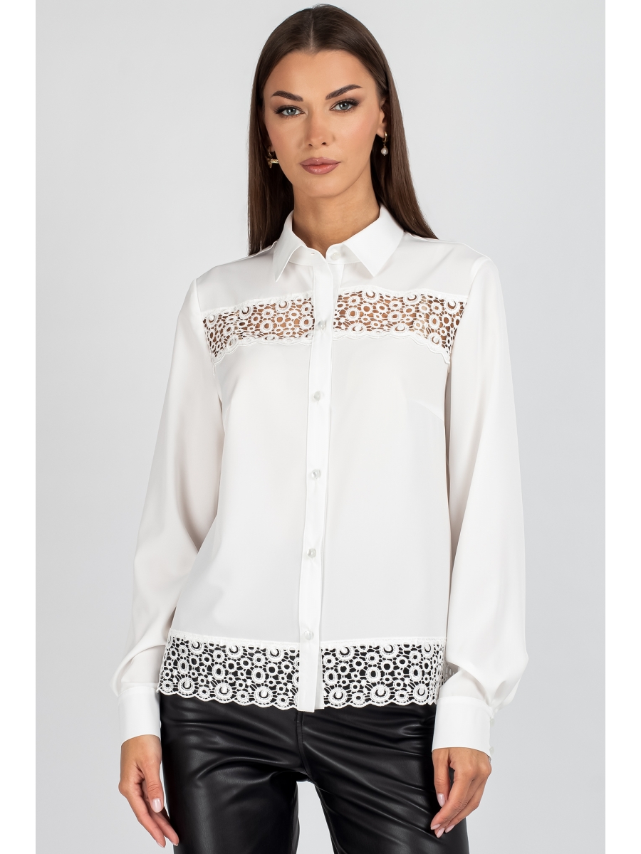 Передняя часть c нагрудными выточками, обеспечивающими комфортную посадку. Центральная бортовая застёжка — на 6 или 7 пуговиц (в зависимости от размера), придаёт образу классическую завершённость. Особое внимание привлекает кружево, изящно нашитое в верхней и нижней части переда — оно добавляет лёгкости и утончённости, делая блузку особенно женственной.