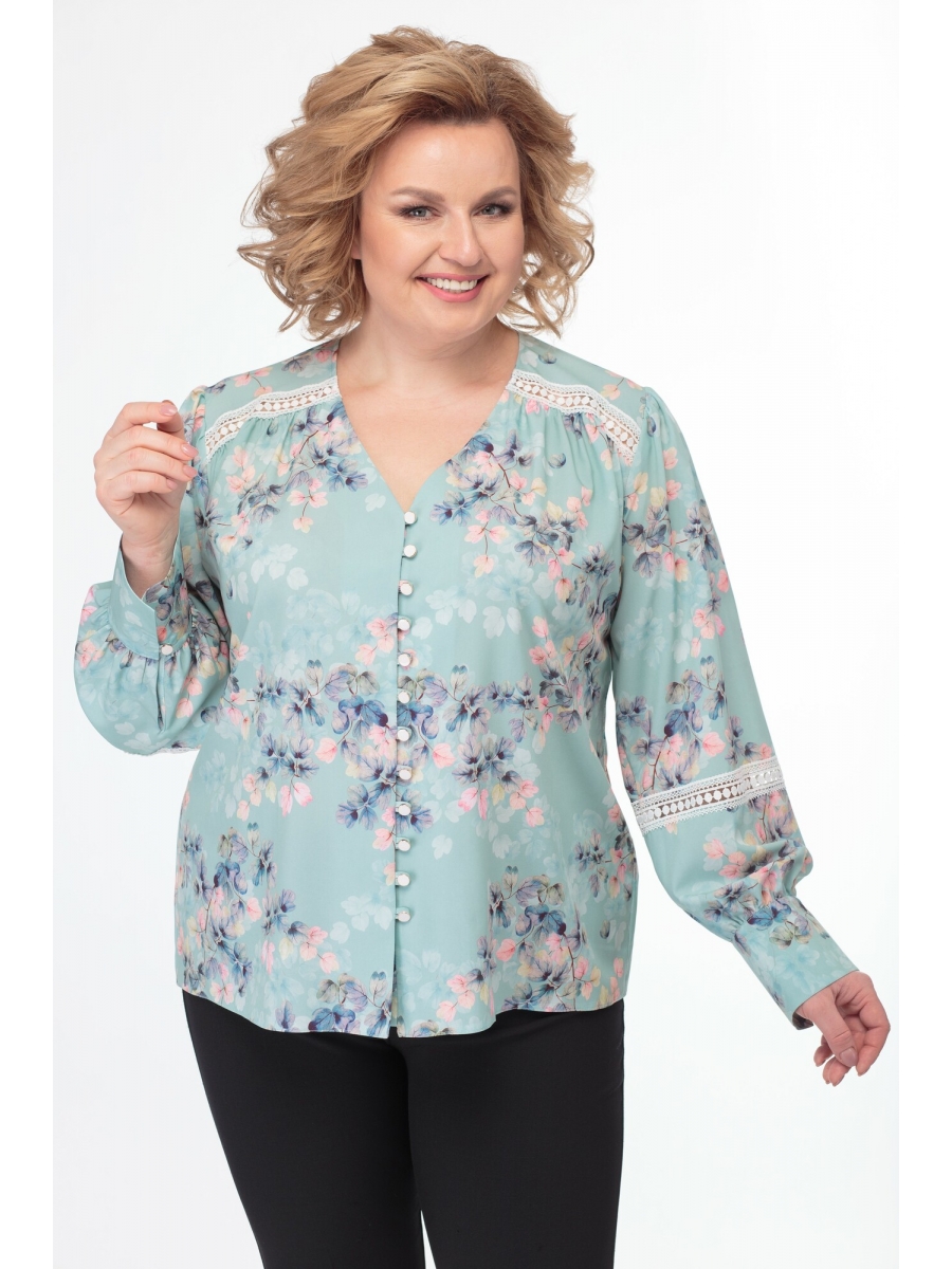 Перед и спинка с романтичными кокетками и кружевными вставками, v-образный вырез горловины, застежка на навесные петельки и пуговицы. Втачной рукав на манжете и кружевной вставкой. Идеально сочетается с юбкой и брюками. Отличный выбор для будней и выходных!