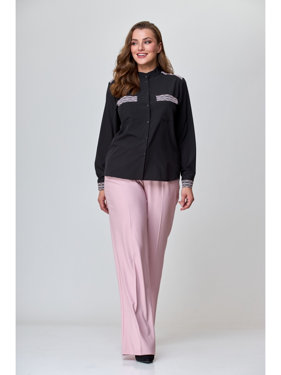 Блуза прямого силуэта, средней длины, На передних частях выполнены накладные карманы с отделкой кружевом. Спинка цельная Плечевые швы украшены кружевом Застежка центральная на петли и пуговицы. Воротник-стойка дополняет минималистичный образ. Рукава втачные, длинные, на притачной манжете с кружевом. Линия низа закруглена, в боковых швах оформлены разрезы. Блуза хорошо сочетается с брюками, с юбками.