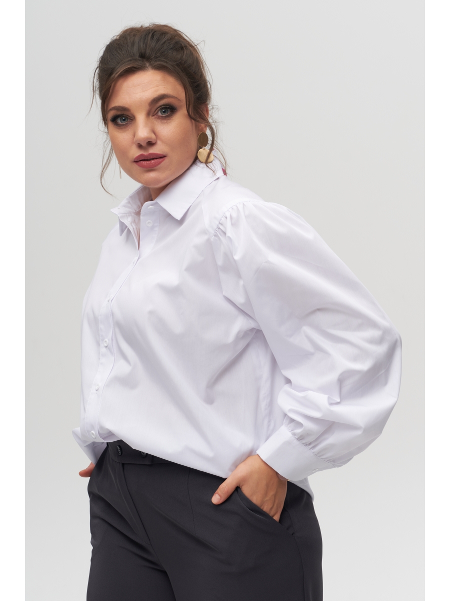 Интересная блуза из хлопка с объемными рукавами. Блуза прямого силуэта, умеренного объема с асимметричной линией низа - спинка удлинённая. Рукава покроя реглан, с отрезной верхней частью, нижняя сосборена по шву притачивания верхней части и манжеты. Застежка центральная на петли и пуговицы. Воротник сорочечного типа Данная блуза прекрасно сочетается с юбками и брюками, поможет составить нескучный повседневный образ и не только.
