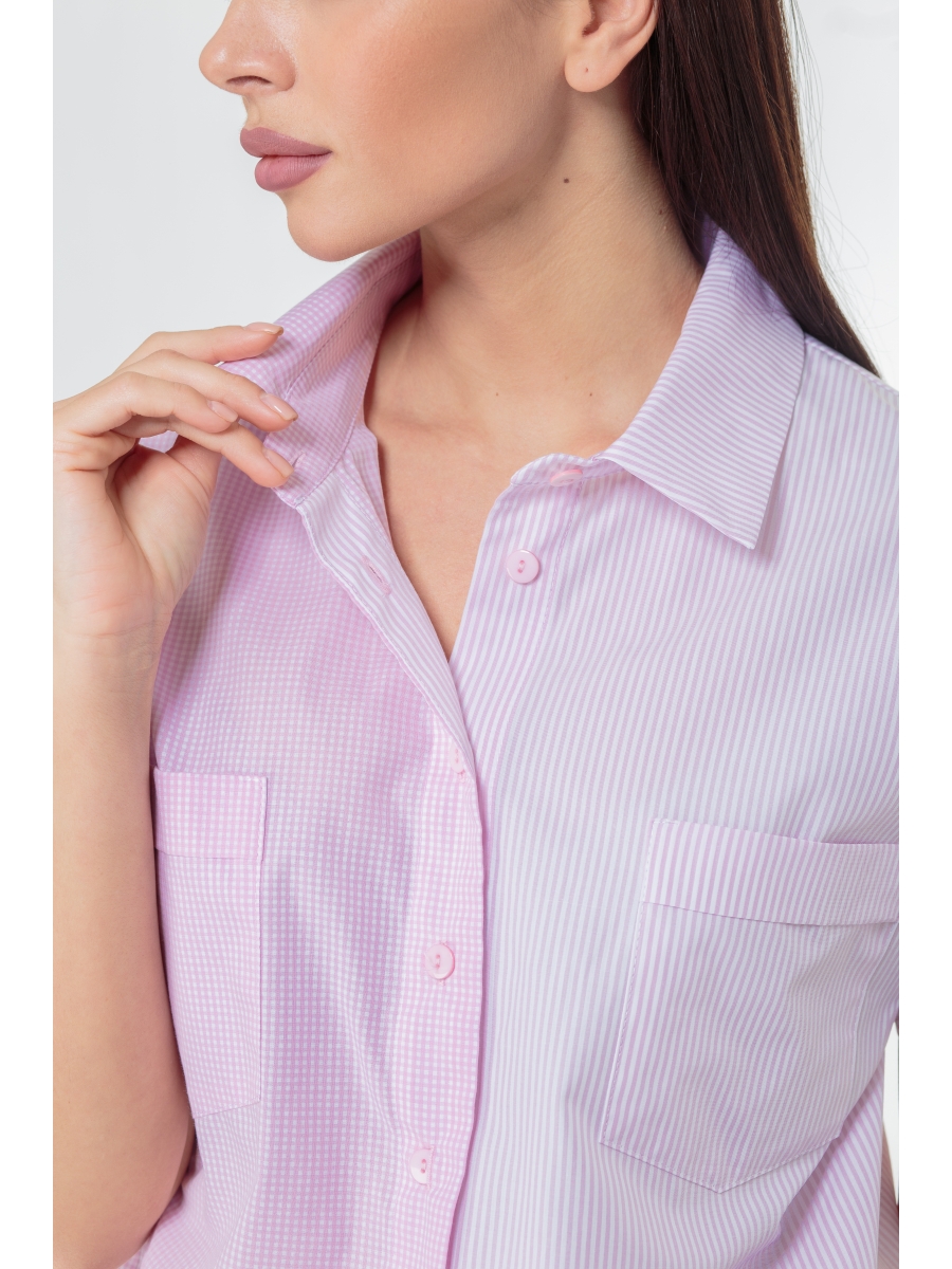 Рубашка прямого силуэта, умеренного объема, с накладными карманами, на нижних частях переда обработаны завязки.