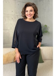 Блуза женская из текстильной ткани . Прямого силуэта. По спинке расположен подрез. В шов вставлено кружево. Рукав спущенный с манжетой. По плечевому шву вставлено кружево. Вырез лодочка. Обработан притачной бейкой.
