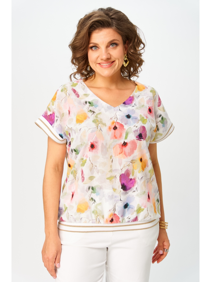 Блузка из мягкой льняной ткани с добавлением вискозы свободного силуэта со спущенной линией плеча. Полочка цельная, спинка с центральным швом. Горловина V-образной формы. Низ блузки и низ цельнокроеного рукава обработаны декоративным трикотажным довязом.