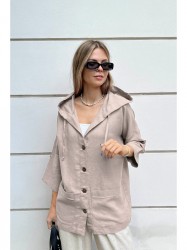 Блузон изготовлен из качественного мягкого льна с эффектом мятости прямого силуэта на пуговицах с капюшоном, со спущеной линией плеча. По переду накладные карманы. Рукав 3/4 с патой, застёгивается на пуговицу.