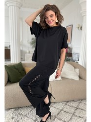 Блуза женская из текстильной ткани. Прямого силуэта. По спинке расположен подрез. В шов вставлено кружево. Рукав спущенный с манжетой. По плечевому шву вставлено кружево. Вырез лодочка. Обработан притачной бейкой.