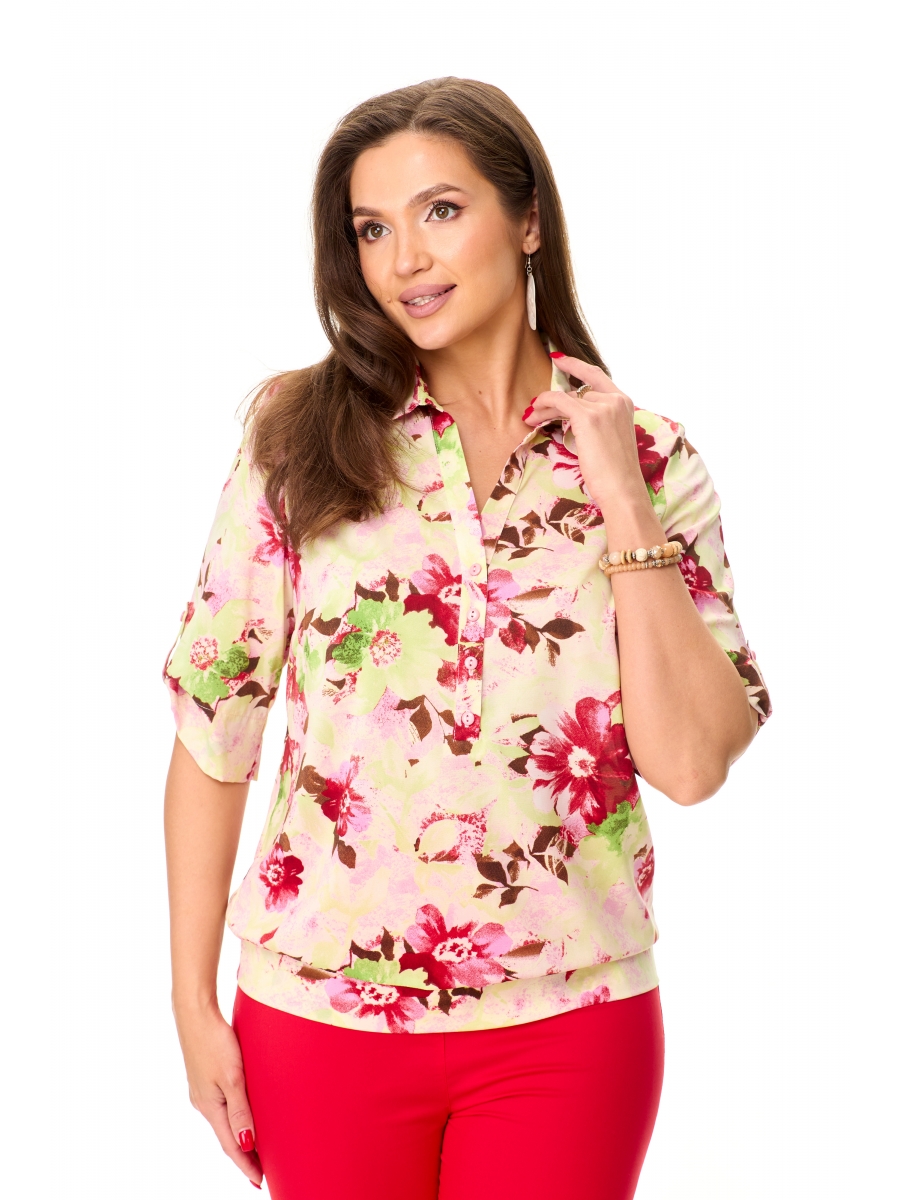 Блузка свободного силуэта. По переду обработана центрально-бортовая застежка на 4 петли и пуговицы, по низу притачная планка. Горловина обтачная с воротником рубашечного типа. Рукава одношовные втачные 3/4, со сборкой на пате с пуговицей. Нагрудные вытачки по переду. Спинка цельнокроеная.