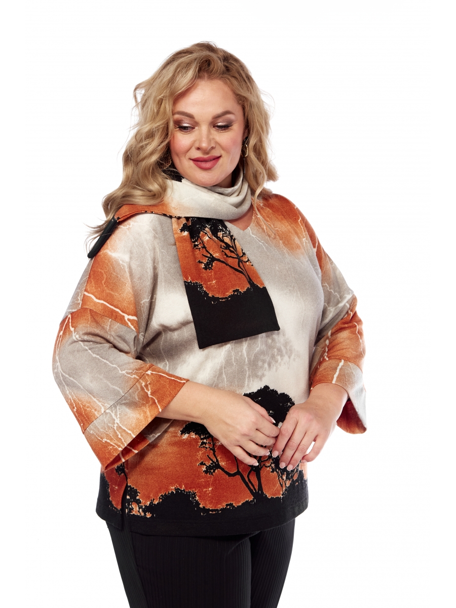 Очаровательная женская блуза, созданная для комфорта и стиля, представляет собой свободный силуэт с V-образным вырезом горловины, спущенным одношовным втачным рукавом и широкими втачными манжетами по кругу рукава. Ткань блузы – эластичный трикотаж с принтом в природном анимализме, обработанный разрезами по бокам. Блузон идеально подходит для роста от 164 до 170 см, достигая середины бедер, и придает элегантность любому типу фигуры.