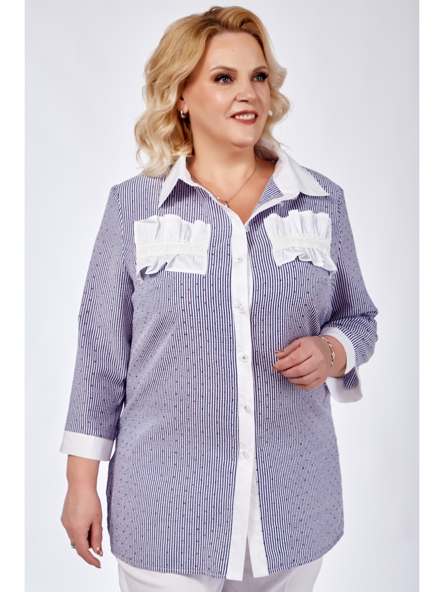 Оформить заказ →Рубашка женская полуприлегающего силуэта, рукав втачной 3/4 с притачным манжетом, застежка центрально-бортовая на петли и пуговицы, в боковых швах разрезы. Манжет, планка, воротник, декоративная деталь выполнены из контрастной ткани.