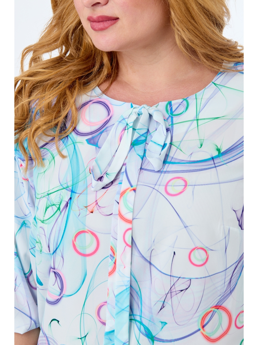 По переду выполнены нагрудные вытачки, линия плеча удлинена, что обеспечивает отличную посадку на любой фигуре, рукава свободные, укороченные, кокетливо присобраны вверху, по низу собраны на резинку. По боковым швам выполнены разрезы, линия низа асимметрична: спинка удлинена относительно переда, горловина округлая, с завязками.