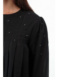 Округлый вырез горловины, обработанный притачной планкой - обтачкой, застежка-прорежка на спинке вверху. Втачные расширенные рукава со сборкой по откату и по низу на эластичной тесьме. По переду и рукавам нанесена россыпь маленьких камней.