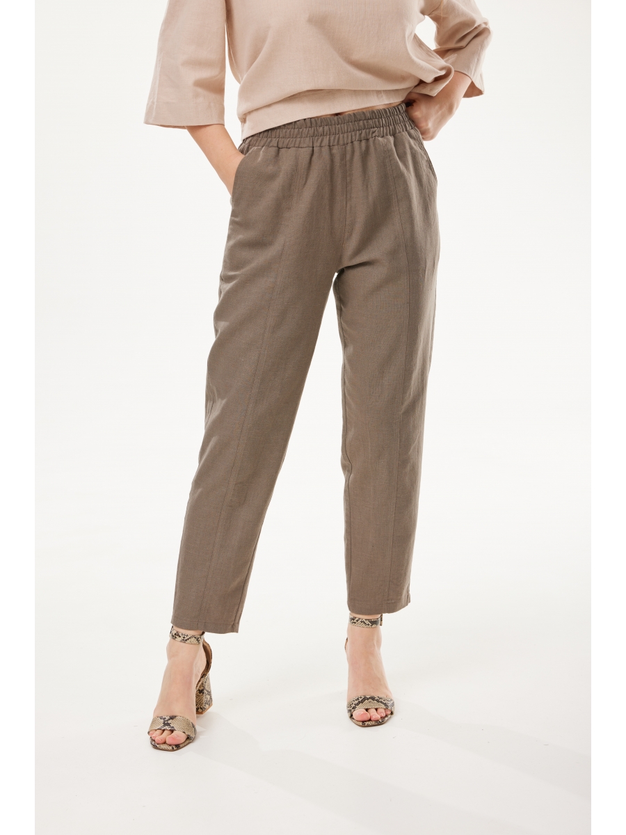Удобные брюки-бананы изготовлены из качественного льна с эффектом мятости. Брюки летнего ассортимента, свободные по бёдрам, к низу заужены, с поясом на резинке, без молнии. Отстрочены по переду отделочной строчкой, с внутренними карманами. Сзади накладные карманы.