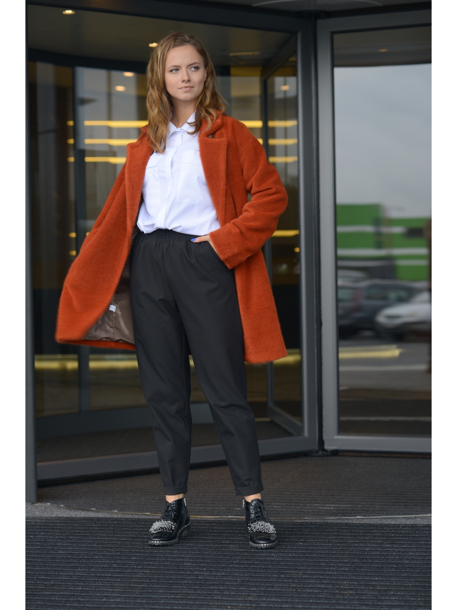 Оформить заказ →Брюки женские повседневные, зауженные к низу. На передних половинках - боковые карманы, на задних - кокетки и накладные карманы. Верхний и срез брюк собран на широкую эластичную тесьму «резинка». Низ брюк заутюжен на лицевую сторону два раза без обработки среза низа.