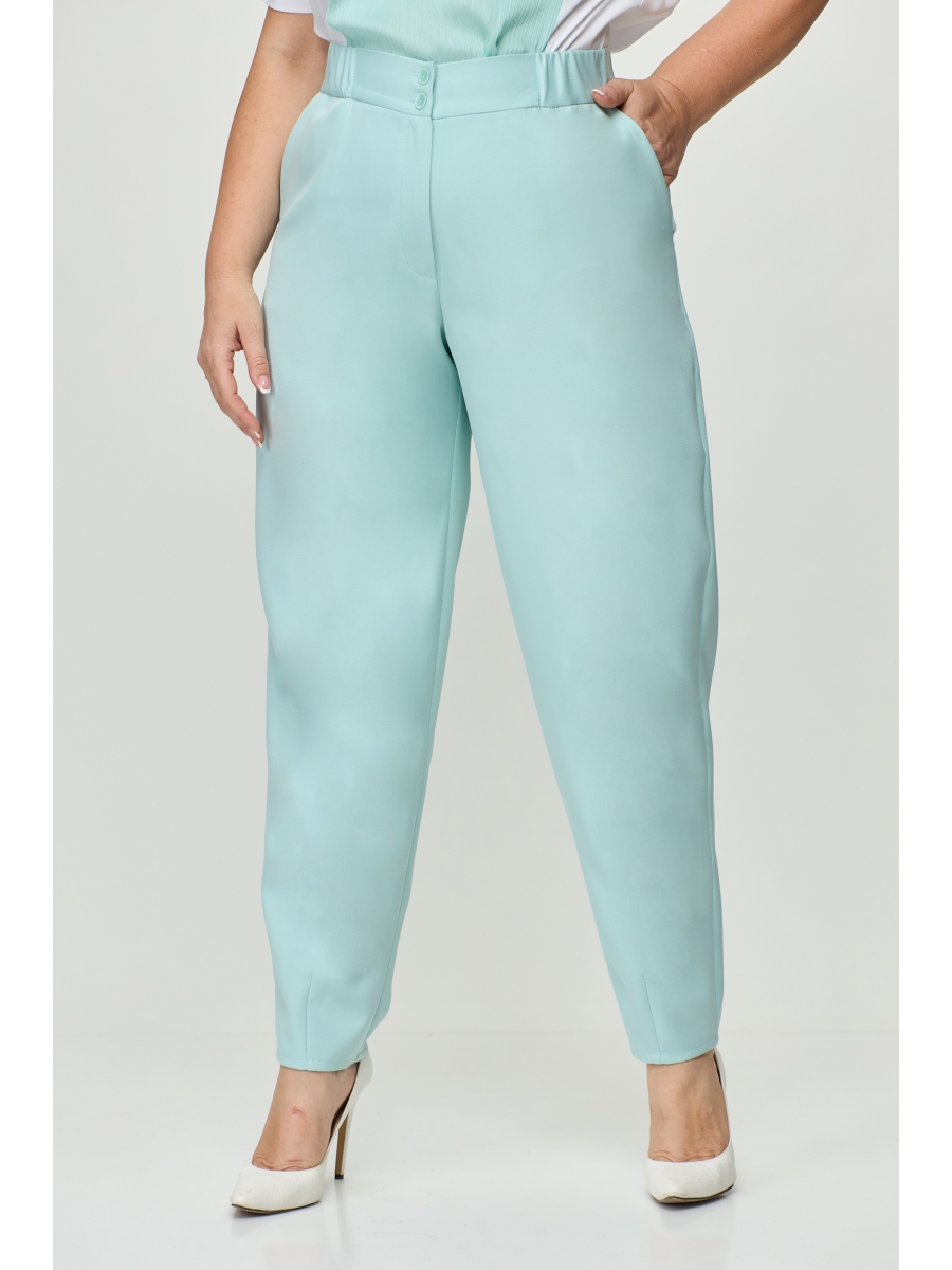 Брюки женские, свободного покроя средней посадки. Притачной пояс с окантовкой срезом, на резинке по бокам и спинке. Застежка по переду на петли-пуговицы и молнию. В боковых швах карманы "хулиганы" функциональные.