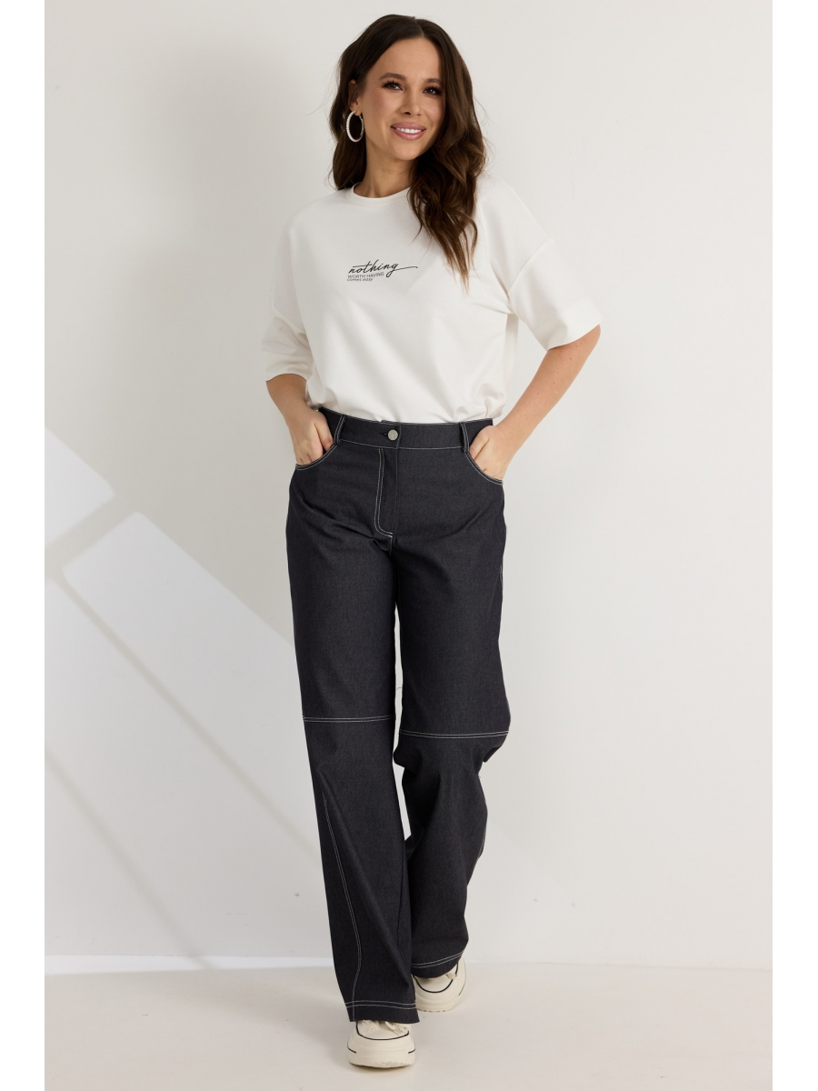 Брюки прямого свободного кроя. Выполнены из джинсового полотна средней плотности. Брюки дополнены декоративными строчками вдоль швов, а также металлическими заклепками. Пояс притачной, по спинке дополнен эластичной тесьмой. Спереди застежка гульфик с молнией и пуговицей. Брюки дополнены боковыми карманами, а также накладными карманами сзади.