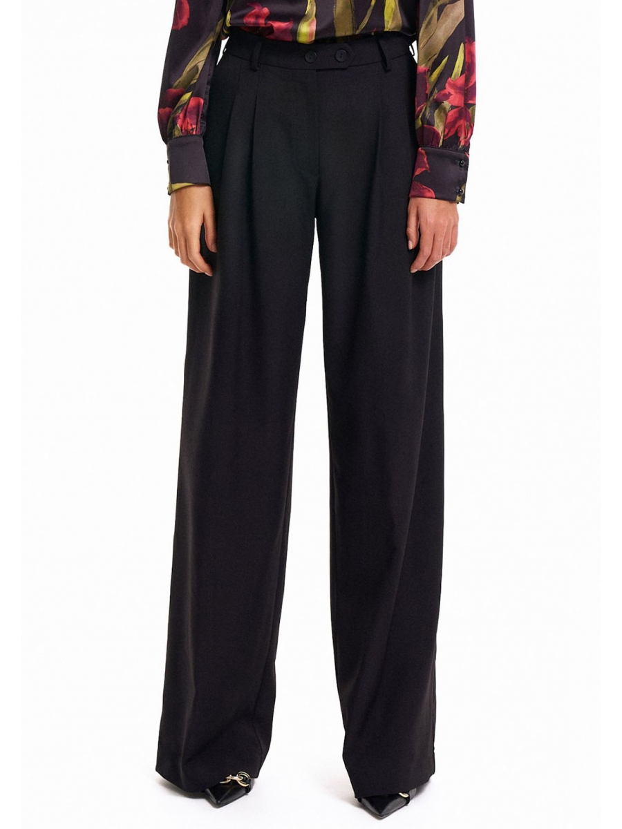 Оформить заказ →Брюки женские прямого силуэта, вида «палаццо». На передних половинках брюк по линии талии заложены две односторонние складки, направленные в сторону бокового шва и функциональные карманы с отрезным бочком. На задних половинках находятся по две талиевые вытачки. Пояс отрезной, притачной, с уступом на правой передней половинке. На поясе шлевки. Верхний край пояса расположен на естественной линии талии. Застежка брюк – классический гульфик. Застежка пояса на две пуговицы и две петли.