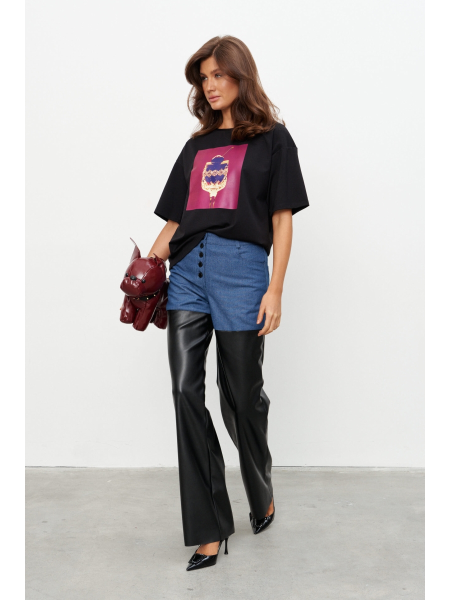 Оформить заказ →Брюки прямого силуэта выполнены на сочетании плотного джинса и экокожи. Брюки на поясе со шлёвками и застежкой на металлические пуговицы-болты. По переду два прорезных кармана, по спинке - два накладных.