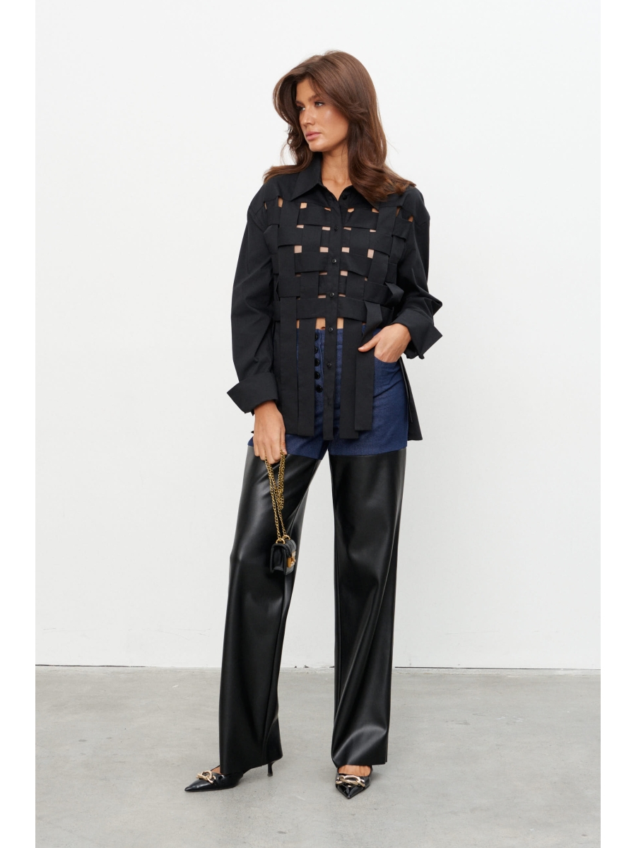 Брюки прямого силуэта выполнены на сочетании плотного джинса и экокожи. Брюки на поясе со шлёвками и застежкой на металлические пуговицы-болты. По переду два прорезных кармана, по спинке - два накладных.