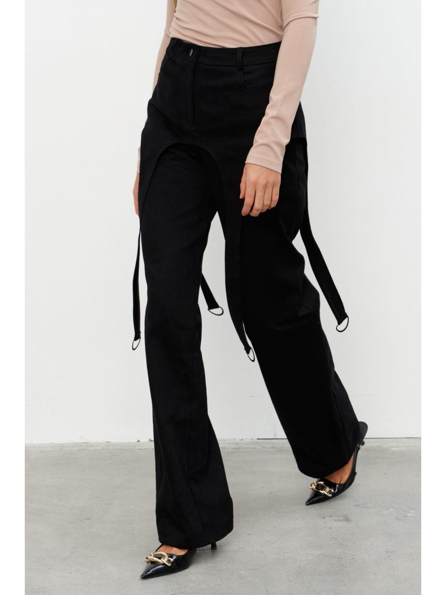Брюки прямого силуэта из плотного джинса с баской. Брюки на поясе со шлёвками и застёжкой на пуговицу-болт и молнию. Чуть ниже шва сидения идут подрезы имитирующие по форме мини-шорты. По переду два прорезных кармана, по спинке - два накладных.