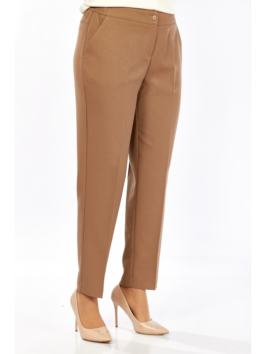 Брюки женские классические из костюмной ткани. В брюках обработан пояс, частично на резинке. Застежка на молнию, петлю и пуговицу. В брюках обработаны боковые карманы. На задней части брюк — кокетка.