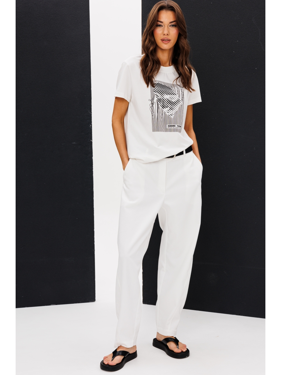 Брюки покроя ""barrel"", расширенные в области икры и зауженные к низу. Пояс притачной, эластичный в области спинки. По передним половинкам брюк-застежка и боковой наклонный карман. По задним-вертикальный шов. Боковой шов смещен в сторону центра передних половинок брюк. По низу-пата с регулирующими пуговицами, позволяющая создавать разную ширину брюк внизу.