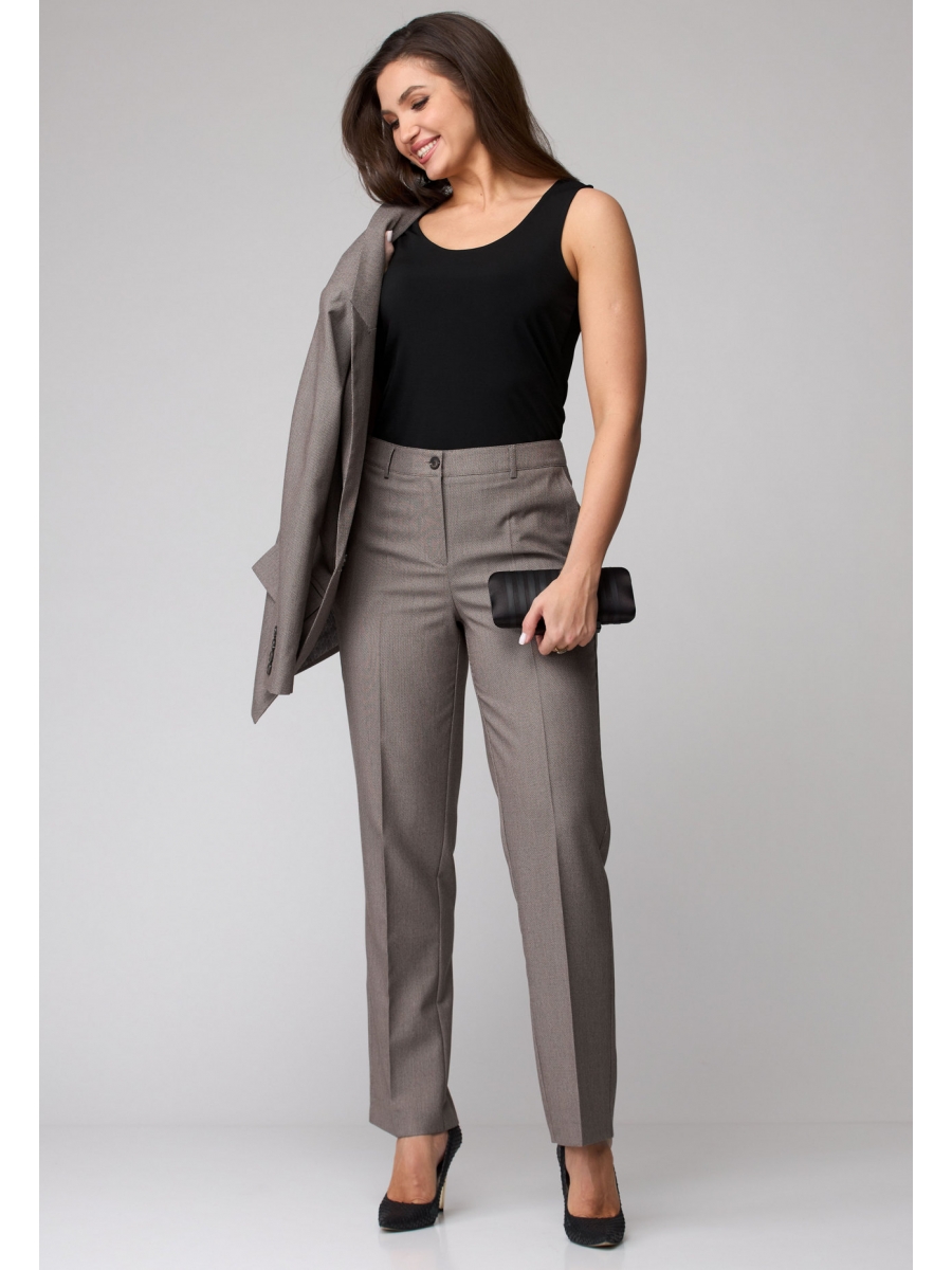 Брюки прямые, классические, с заутюженными стрелками, по переду обработаны карманы с отрезным бочком, застежка на тесьму-молнию и 1 пуговицу. На задних половинках обработаны вытачки и имитация карманов с листочкой, пояс в брюках притачной.