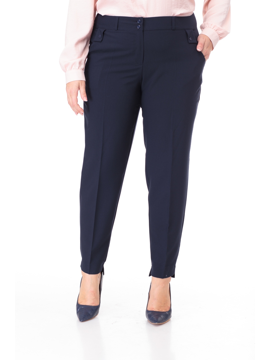 Брюки классические, слегка заужены к низу, с ассиметричным низом, боковые карманы с закруглённым входом и патой; на задних половинках не рабочие карманы с листочкой, пояс-обтачка притачной.