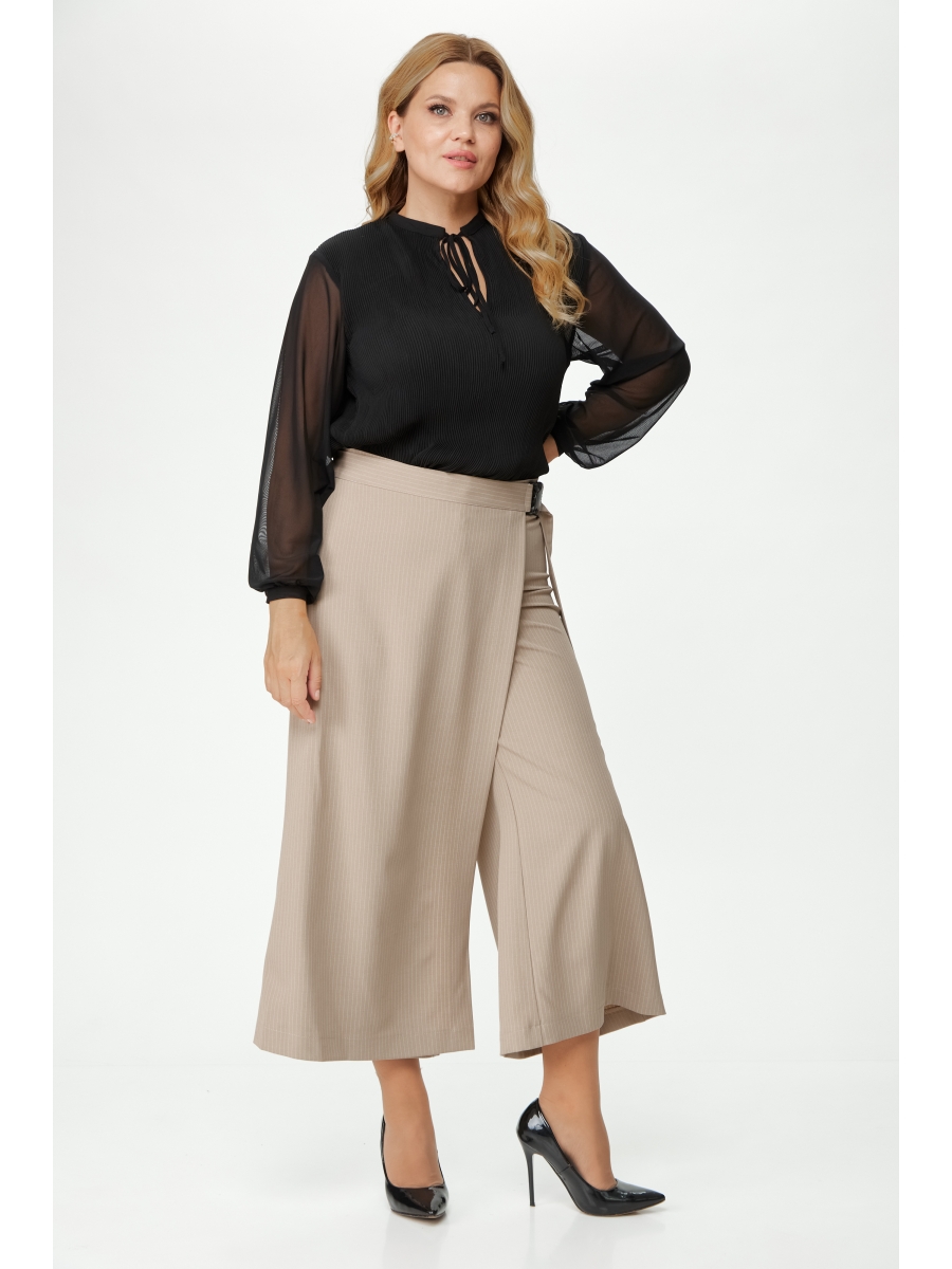 Модные брюки-кюлоты с элегантным запахом, свободной посадки, брючины широкие укороченные, чуть выше щиколотки. По переду молния, сзади по поясу вставлена резинка, запах фиксируется поясом на пряжке. С данными брюками можно смело создавать стильные комбинации с вещами Вашего гардероба.