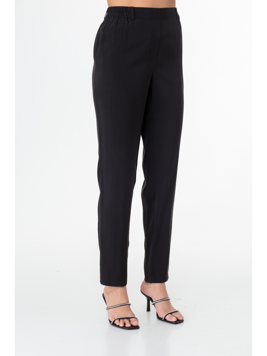 Брюки высокой посадки с функциональными боковыми карманами, притачным поясом на эластичной тесьме.