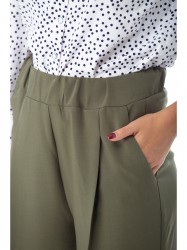 Брюки ддиной по щиколотку, на передних частях брюк обработаны боковые карманы с наклонным входом, на брюках заутюжены стрелки, переходящие в складку по линии талии на передних частях.