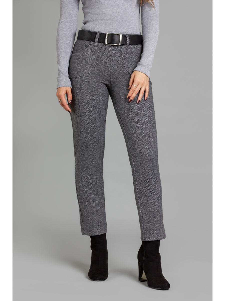 Брюки 7/8 зимнего ассортимента, зауженные к низу. По переду накладные карманы. На задних половинках снизу небольшие разрезы.Застёгиваются спереди на молнию.