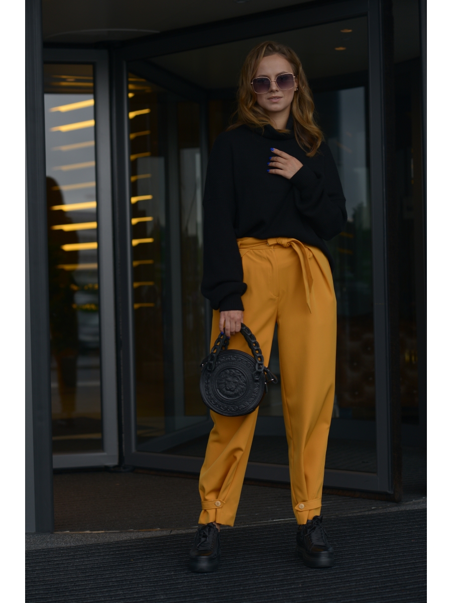 Оформить заказ →Брюки женские повседневные, прямые к низу, со съёмным поясом. На передней половинке - складки и боковые карманы, на задней - вытачки по линии талии и накладные карманы. Верхний срез обработан притачным поясом со шлёвками. Застёжка – на тесьму-молния в среднем шве передних половинок и одну обмётанную петлю и пуговицу. В боковом шве по низу вставлен клин с патой пристёгивающуюся на пуговицу. Низ брюк без манжеты.