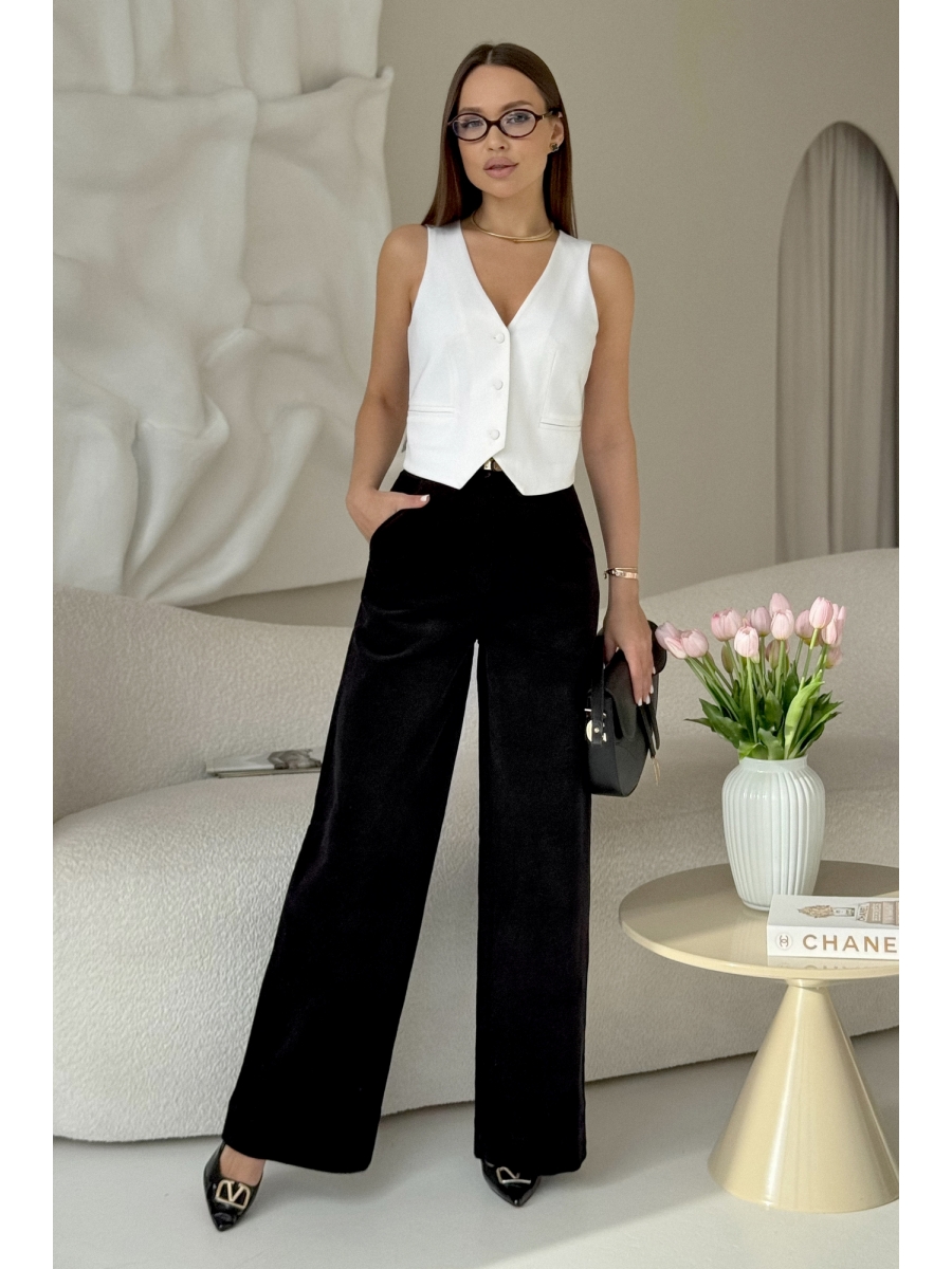 Брюки женские прямые из текстильной хлопковой ткани (вельвет-штрукс). В боковых швах расположены подрезные карманы. По задним половинкам расположены талиевые вытачки. Верх брюк обработан притачным поясом со шлевками.