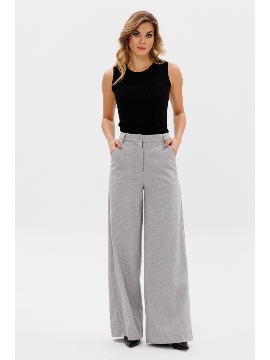 Брюки женские прямые из трикотажной ткани. В боковых швах расположены подрезные карманы. По задним половинкам расположены талиевые вытачки. Верх брюк обработан притачным поясом со шлевками.